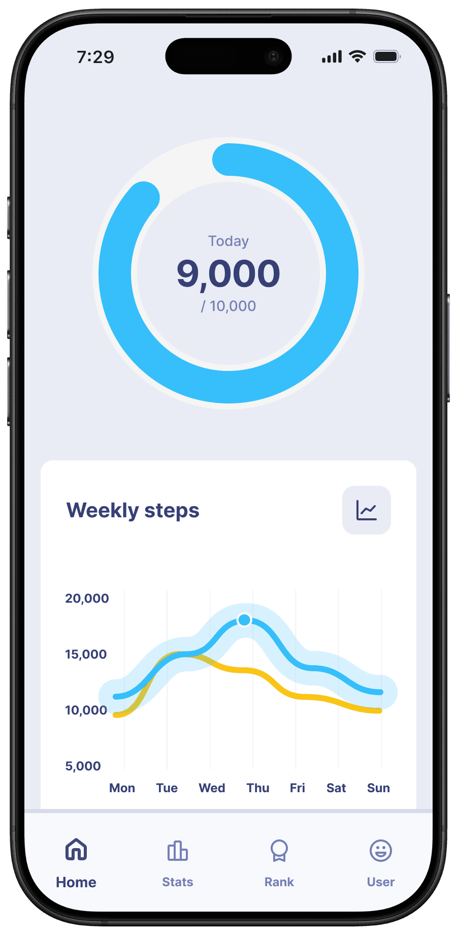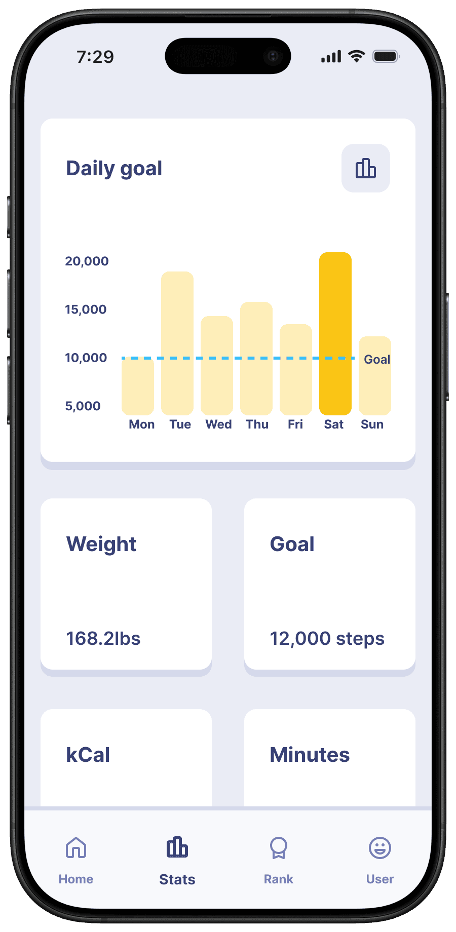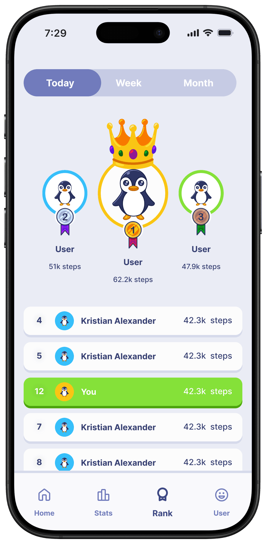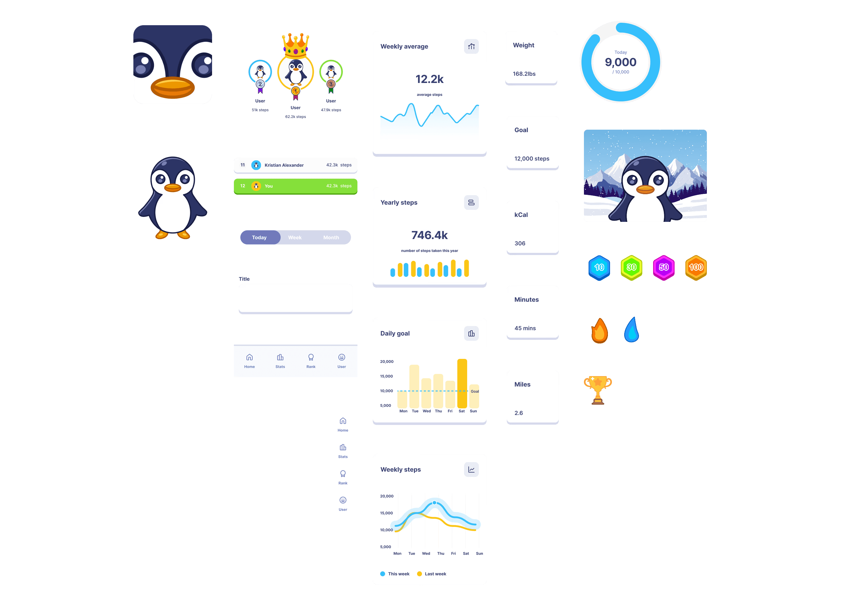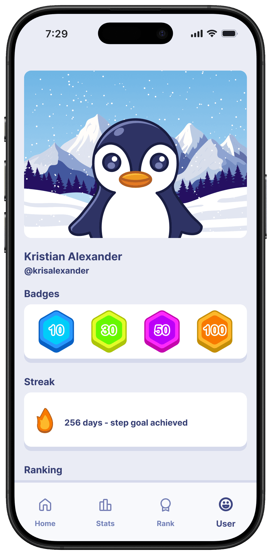 i created a fun engaging application to motivate users to be more active. the first way in which this has been accomplished is through the mascot named "waddle". the penguin mascot exists not only as the face of the application but also has a personality. when reaching goals or failing to do so, waddle's will make sure to let you know! the ranking system i found to be yet another engaging way of motivating users to not only reach their goals but to exceed them in hopes of reaching the top. doing so unlocks badges, exclusives, and even cosmetics for waddles!